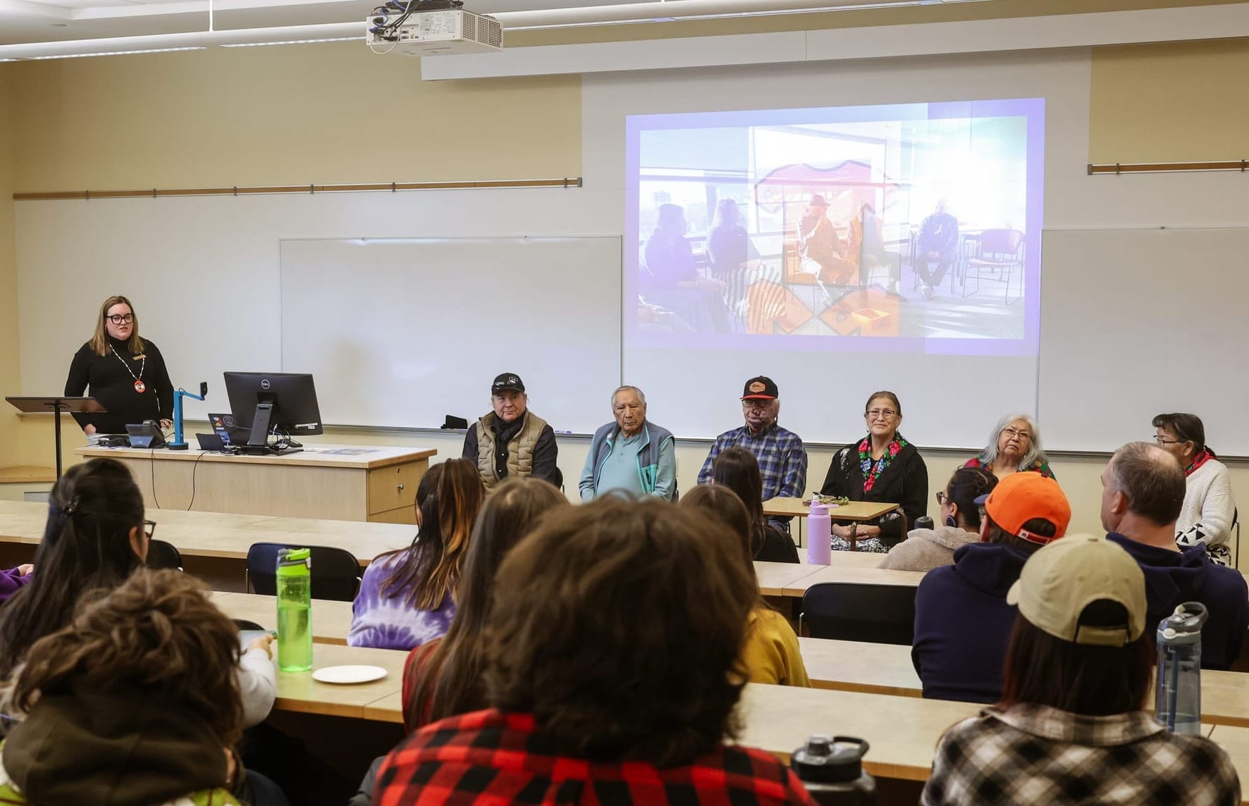 The naming ceremony was accompanied by the official unveiling of the Blackfoot Mural, “Honouring our Grandmothers”, designed by accomplished multi-disciplinary artist, author, instructor and alumna, Nato’yi’kina’soyi (Holy Light that Shines Bright), Dr. Hali Heavy Shield (BA/BEd ’06, MEd ’12, PhD ’24).
