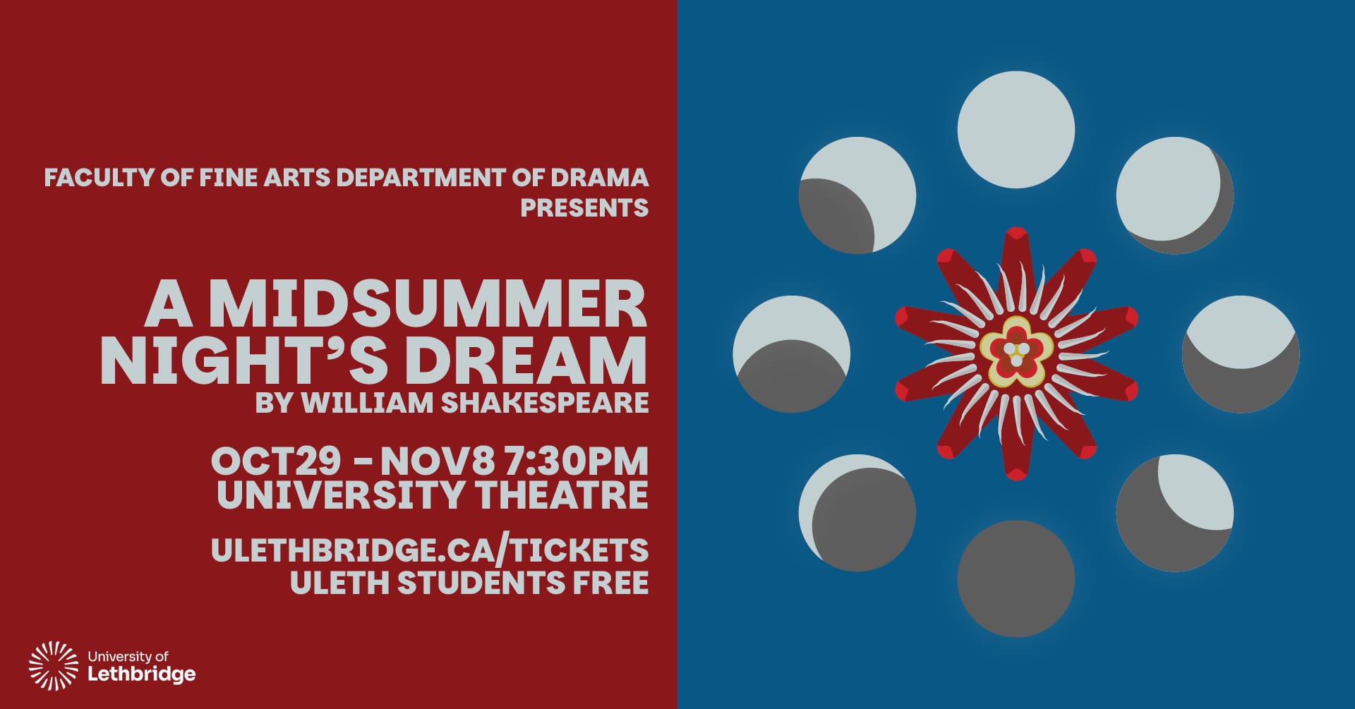 Join us October 29, and November 1, 6, 7, 8 at 7:30 p.m. nightly in the University Theatre (W500). Tickets for A Midsummer Night's Dream are on sale now. ULethbridge students get a free ticket with their student ID.