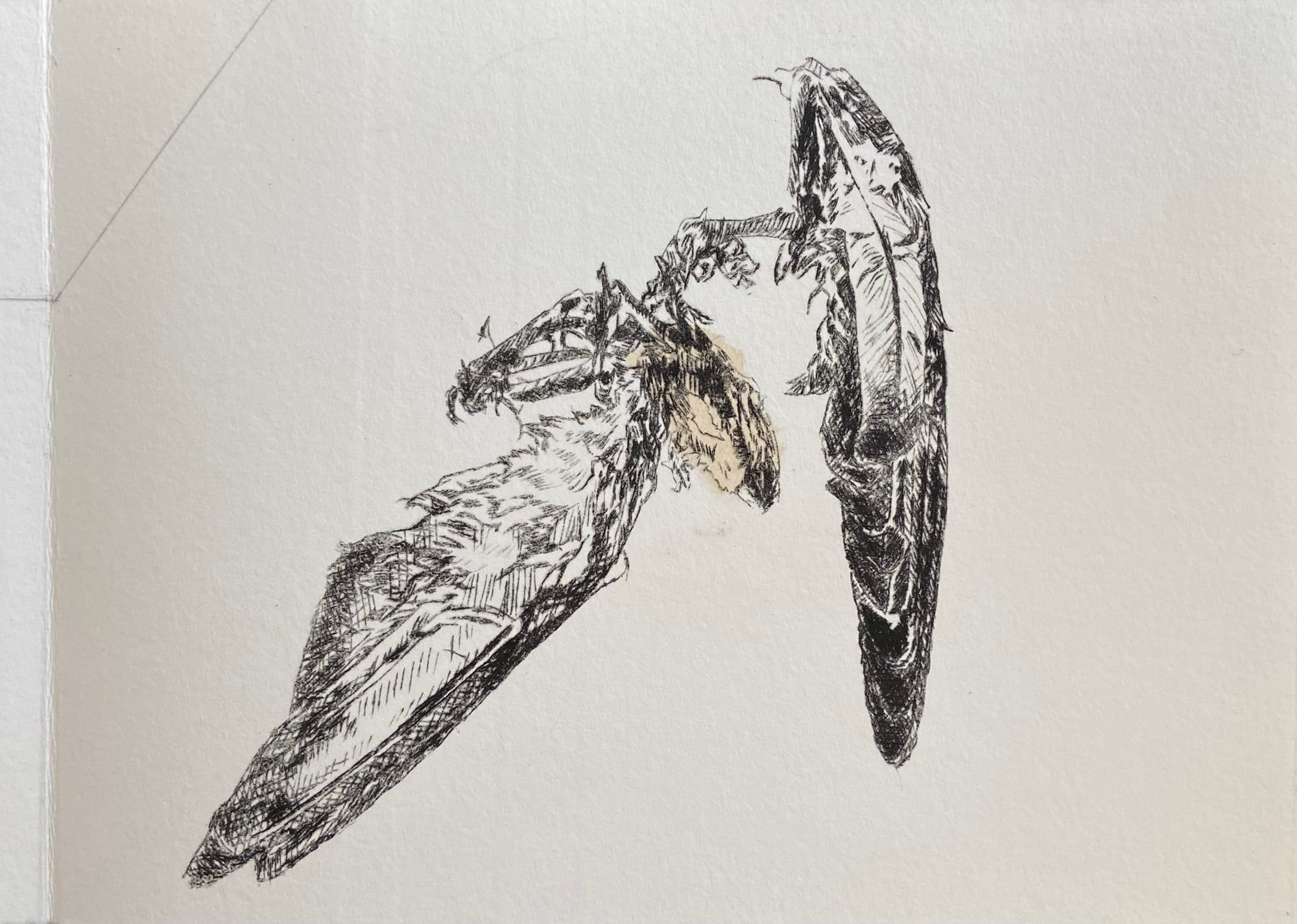 Left: Urban Impositions onto Avian Lives. Bunker Installation, University of Lethbridge. 2025. Centre: wind resurrector: a patio trapped corpse. 2025. Drypoint, kozo, graphite, rice glue. 8 pages, 6 x8”. Right: bird corpse (Bronze). Detail. 2025. Bronze. 10 x 9 x 1”.
