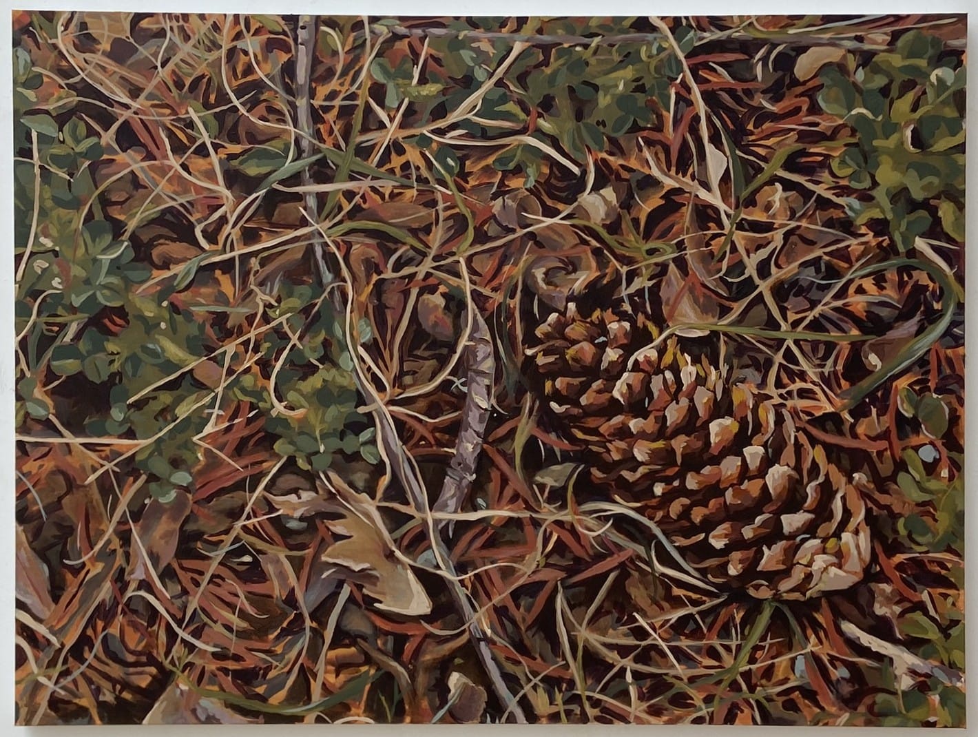 "The first painting I made, Pinecone Fights is of a pinecone I found on the ground. Pinecone Fights commemorates an activity my siblings and I would play with my Grandma; throwing pinecones at each other. This activity was always exciting and amusing, surprising my Grandma with pinecone sneak attacks, laughing at her ridiculous reactions and finding the perfect pinecones. By using a pinecone, isolated to only one, it reflects on this moment of finding and appreciating the mundane and sublime beauty of a pinecone."