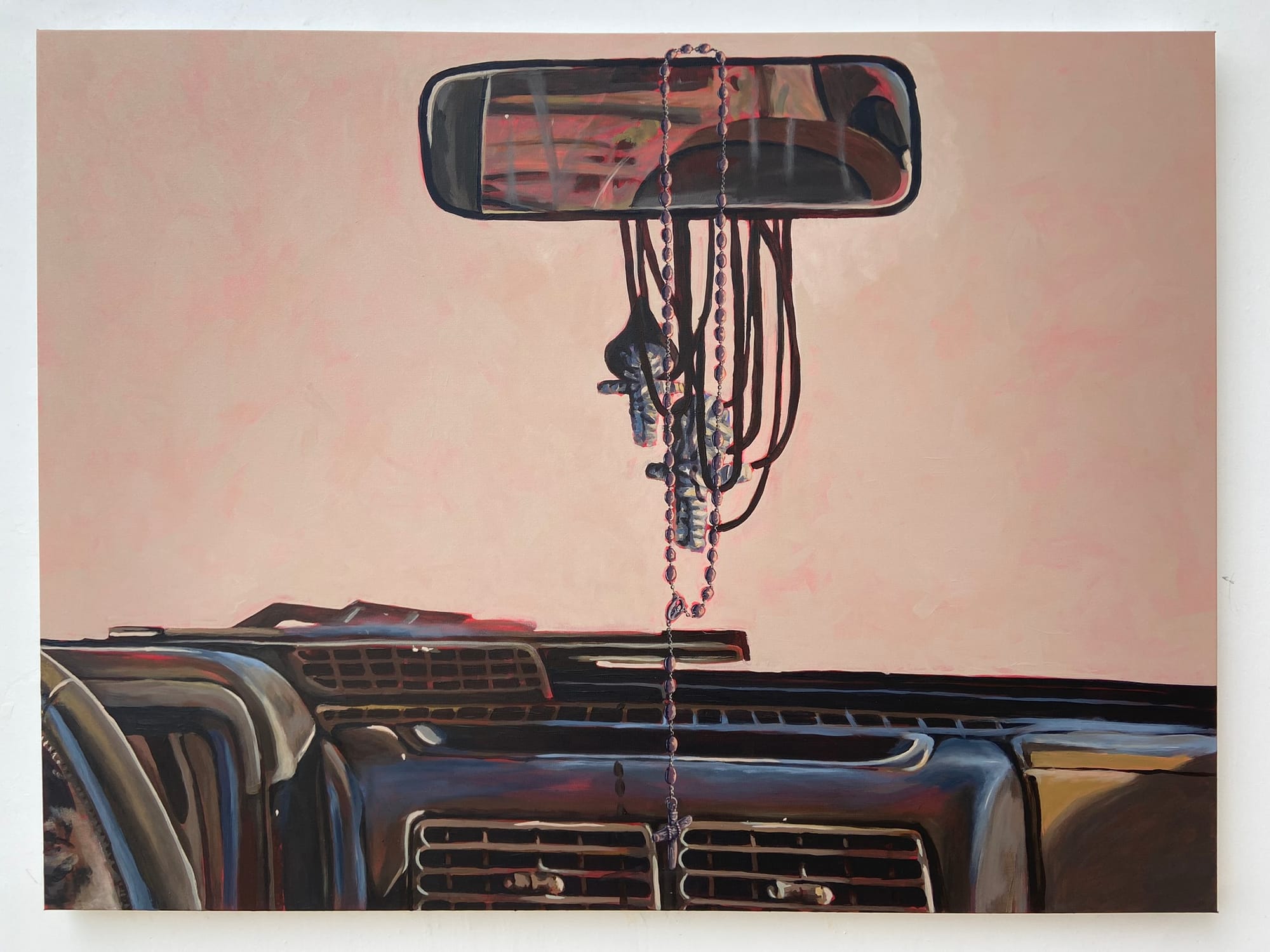 "My second painting, Jesus on the Dashboard, is my memory of one of the rosaries my Grandma had hanging off of her vehicle’s rear view mirror. She wasn’t particularly religious in my memory, but kept this rosary for spiritual reasons and protection. Jesus on the Dashboard represents loss, symbolized by the rosary. I lost this specific rosary, and the loss of my Grandma connected to my loss of one of her most important material artifacts. Three days before leaving for the Gushul, after three years of the rosary being lost, I found it by complete chance."
