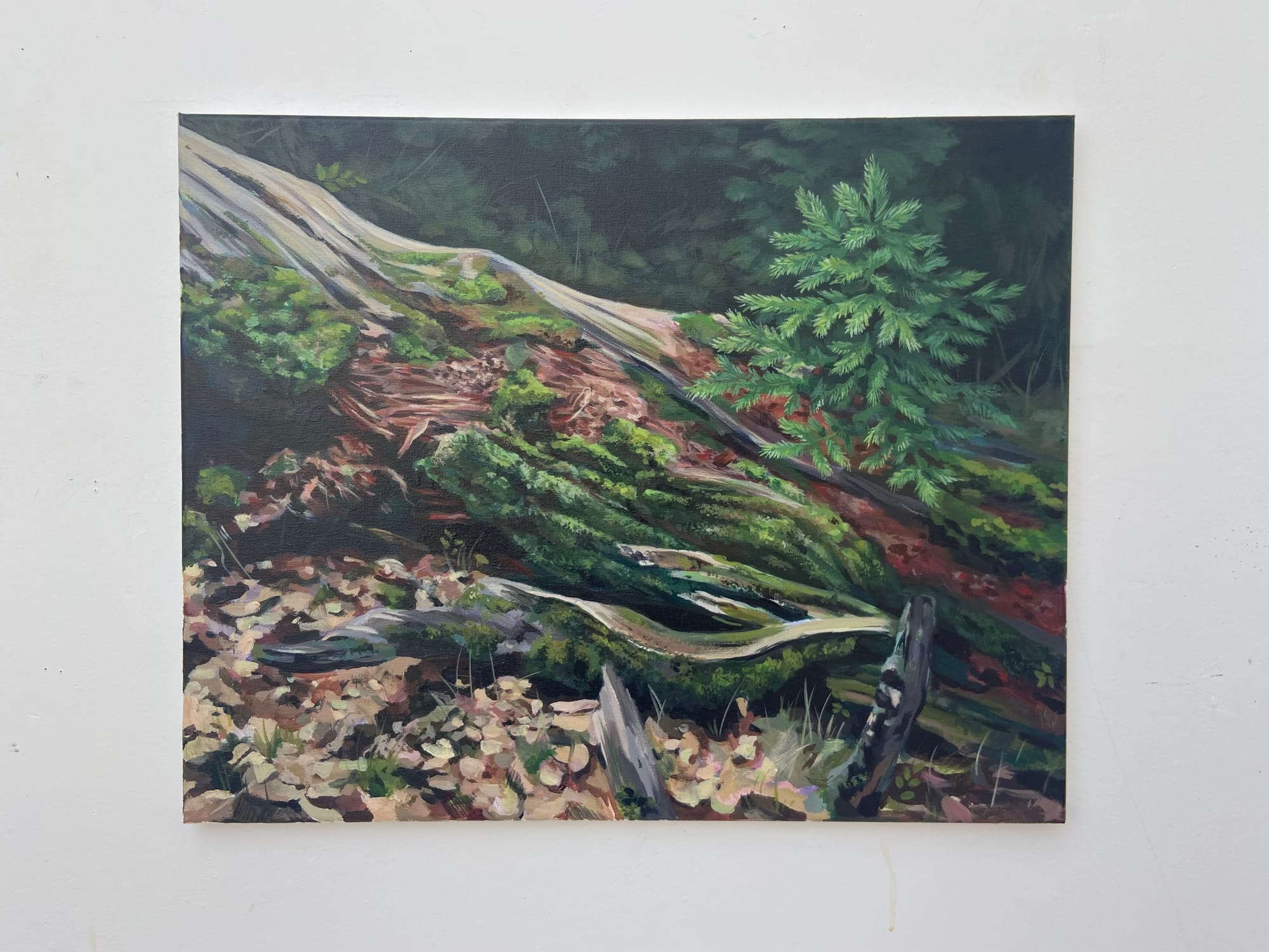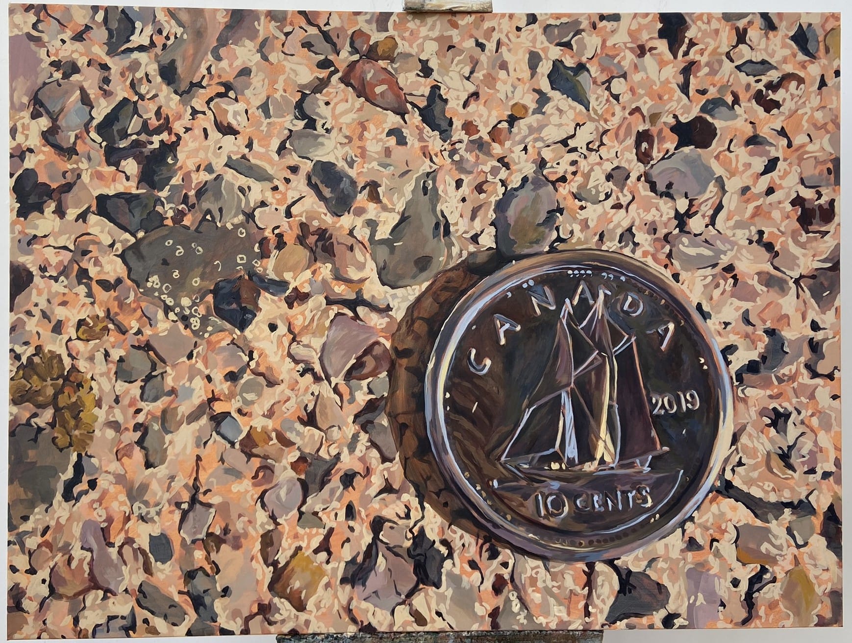"The third painting I created is titled Finding Dimes. Tying both into the finding of pinecones and spiritual memories, Finding Dimes reflects on how familially significant coming across a dime is. My Grandma would always say that finding a dime is a great spiritual sign, meaning an angel is watching over you. Since her passing, that angel has been my Grandma."