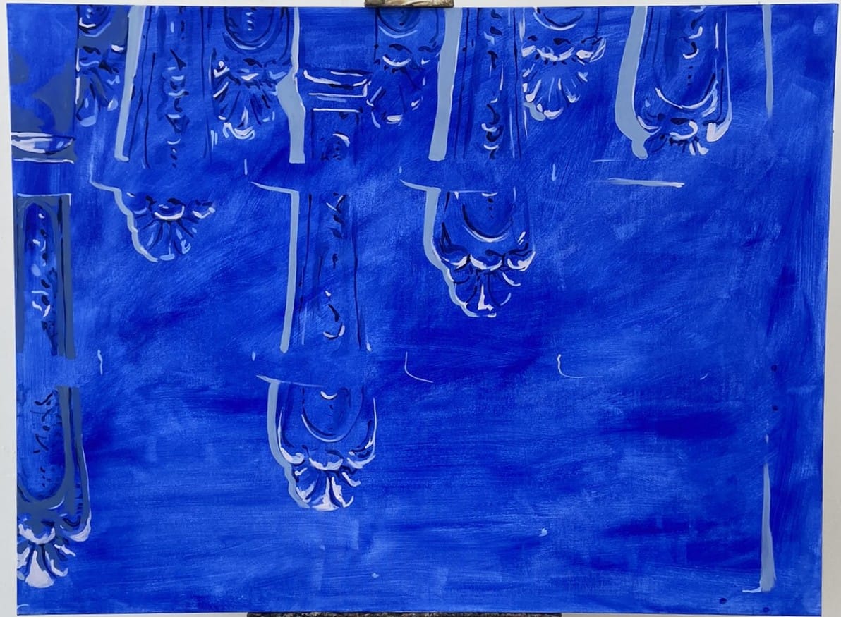 "The fourth painting is currently in progress and untitled, representing a current tense. Because what can be considered as ‘the current’ is ever changing and reflecting on the past, I think that this painting will be something I ruminate on for a long time, especially now considering my time during the Gushul Residency. The painting is of the decorative ends of silverware, a box of cutlery my Grandma left behind as an heirloom for me. The silverware acts as a mirror in a way, though not exact, changing depending on the angle, and distorting. This ability that silverware has, especially when multifaceted with decoration, takes on the multiple and ever changing interpretations and resonances following the loss of a loved one. Because of this, it has been a difficult image to tackle and consider, concluding its unfinished quality, considering the additive nature of the future."