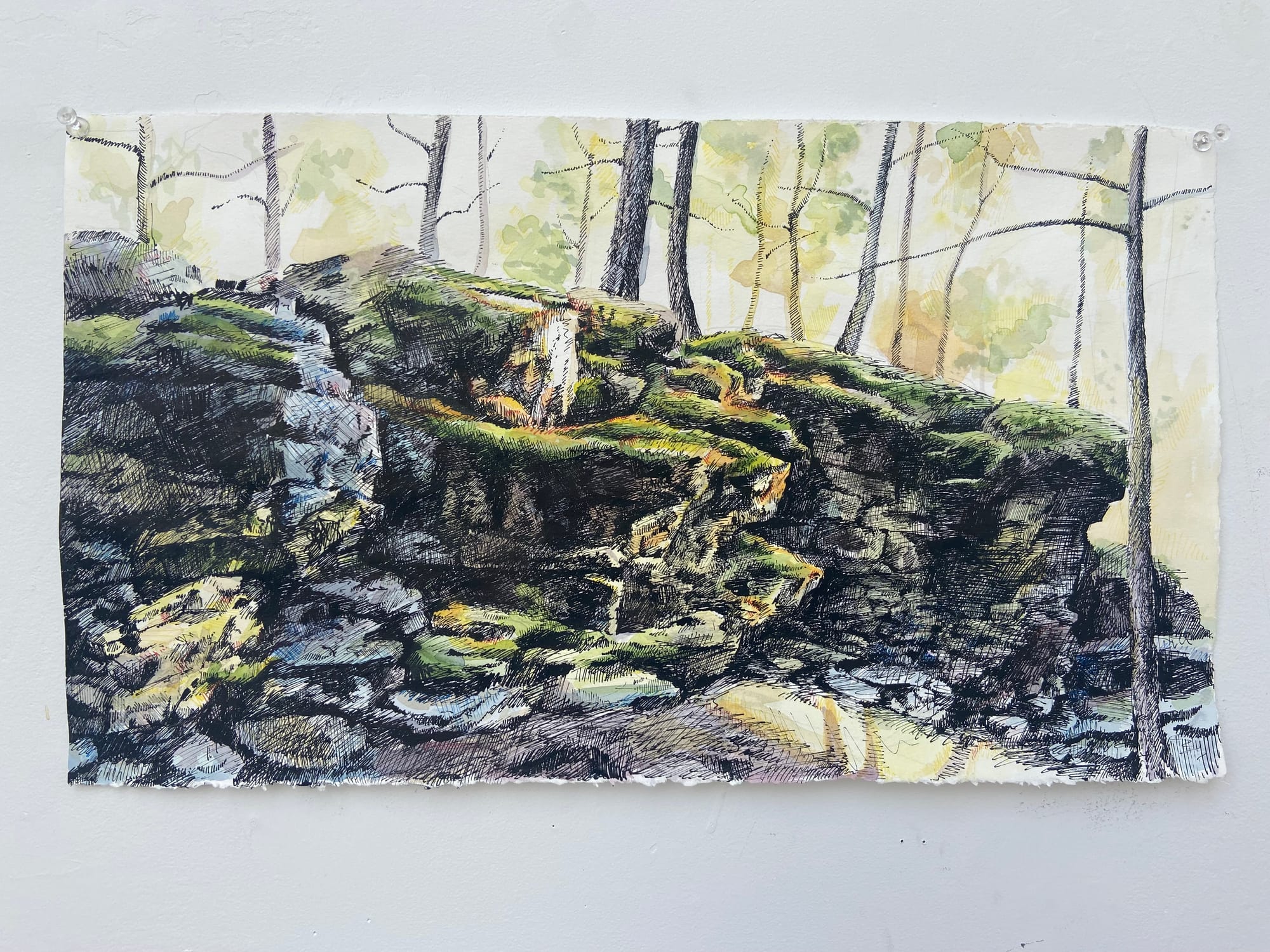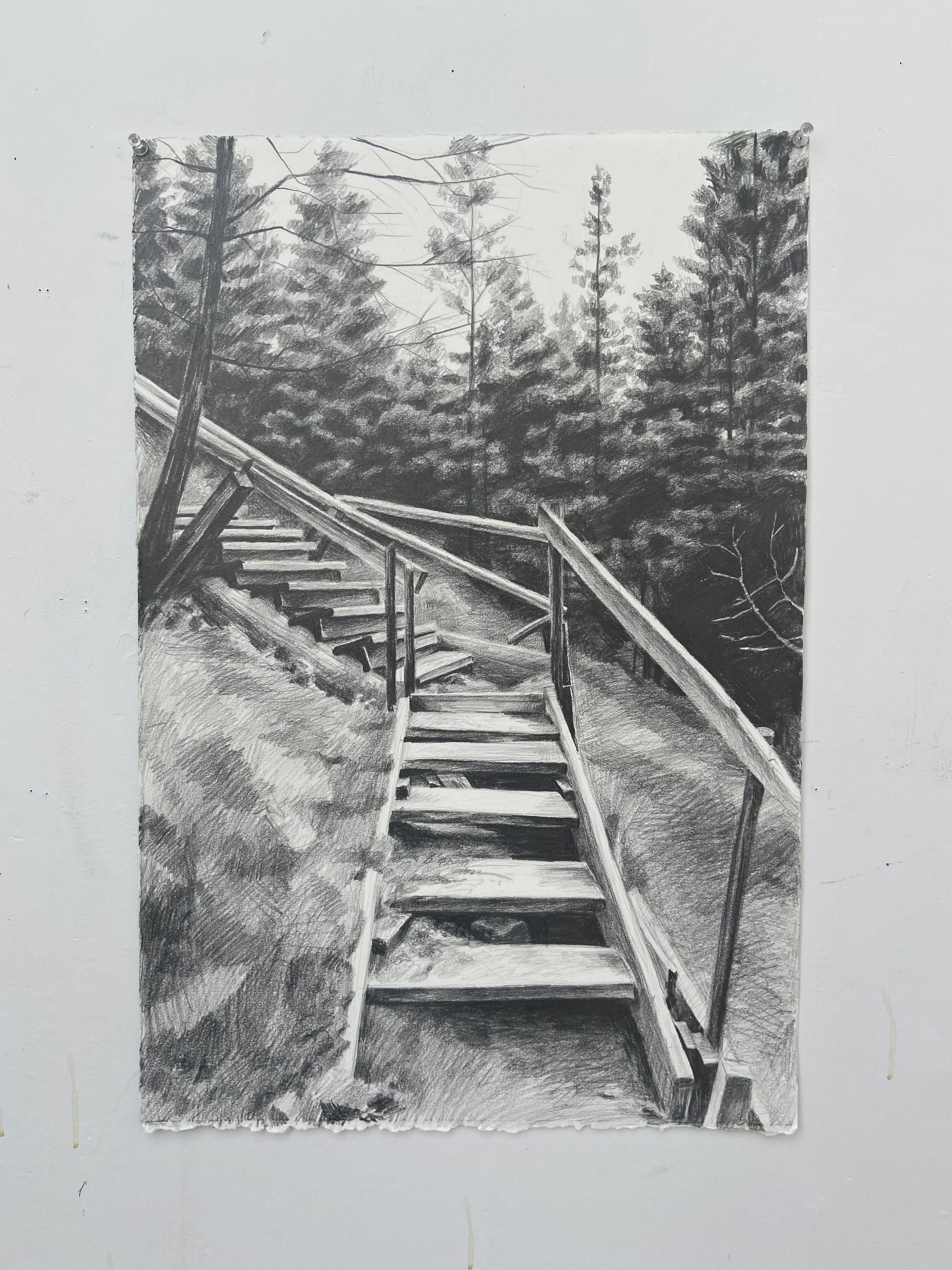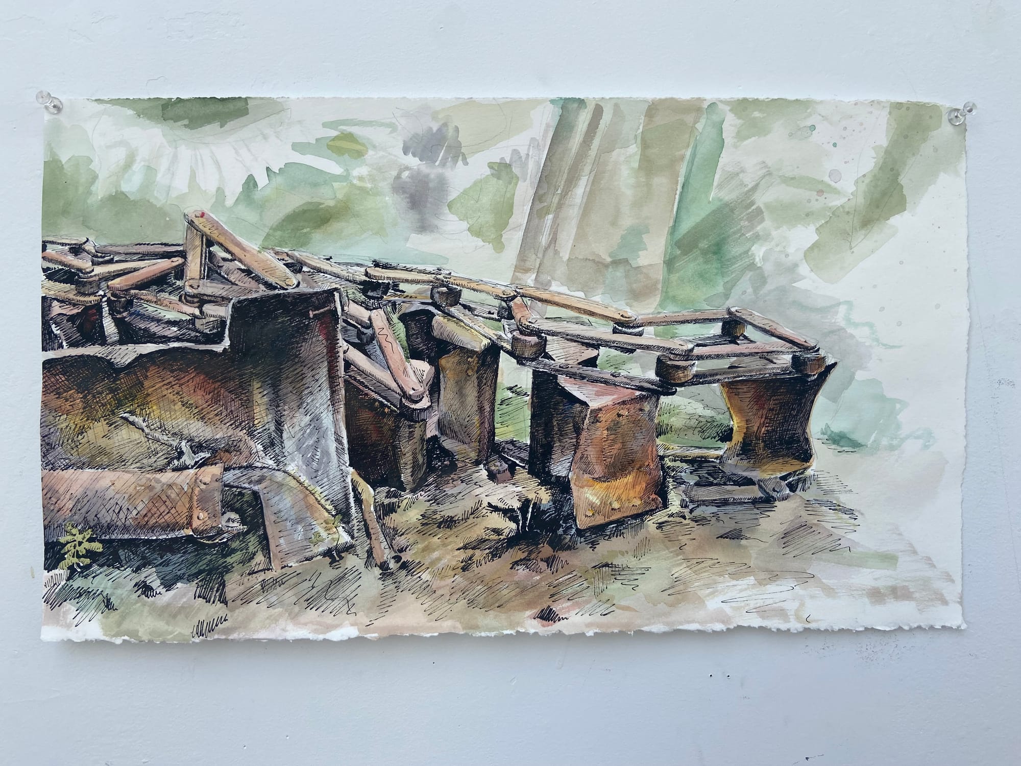 "I spent time observing the surrounding area, taking photos of the environments and the structures of the Crowsnest Pass, and using them as references to complete a number of drawings and paintings. I began my project at the Gushul intending to focus on the way the natural elements in the environment interacted with human made structures in the area, and vice versa."