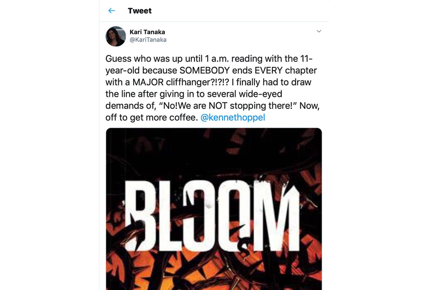 The matter of books on the Faculty of Education Twitter feed is a big deal—just follow some of our faculty members, student teachers, and education community. You'll see evidence of the passion teachers have for books; whether in sharing with the class or reading alongside their children. Recently, Twitter-enthusiast and familar presenter at Faculty of Education book tasting* events, Kari Tanaka, shared a tweet about Kenneth Oppel's book, Bloom. The post exposed a voracious young reader engrossed in a book—whose author "ends EVERY chapter with a "MAJOR cliffhanger"—and of a mother willing to indulge her daughter's urge to read into the early hours of the night. Kari, who always has a book to offer whether shared on campus at the bookstore where she works, or in her Twitter dispatches (not only during the pandemic, but prior) has clearly passed on her bibliophilic tendencies to 11-year-old Asia—a natural and wonderful generational transference.
