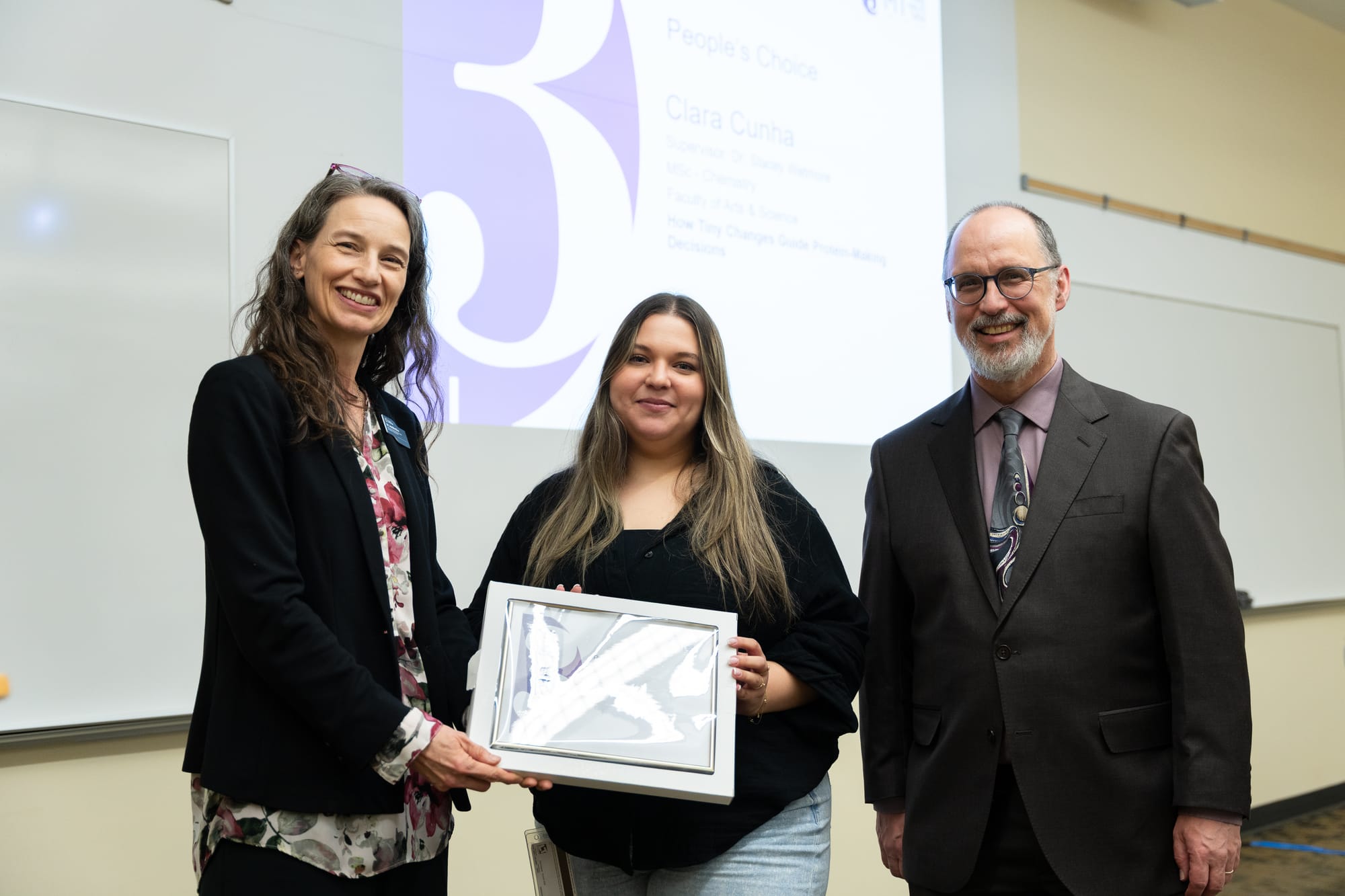 The competition winners were recognized with commemorative plaques and cash prizes. Three Minute Thesis winners received $1,500 for first place, $750 for second, $500 for third, and $250 for the People's Choice award. Images of Research winners received $500 for first place, $250 for second, $100 for third, and $100 for the People's Choice award.