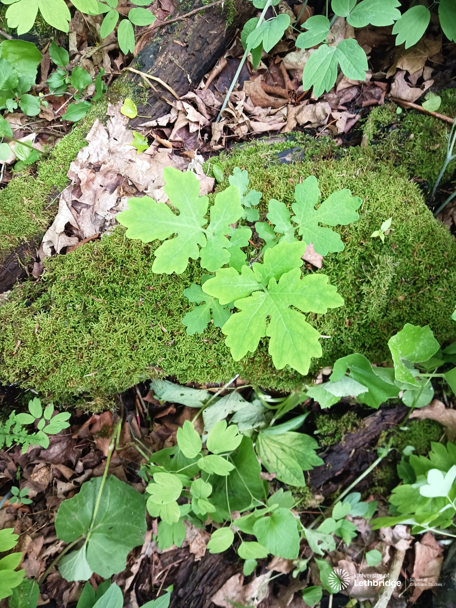 This wood-poppy (Stylophorum diphyllum) plant has survived for three years on a mossy fallen log. Survival of seedlings is an important contributor to population growth for the wood-poppy; few seedlings survive one year to become adult plants. The wood-poppy is endangered in Canada, with only five known populations, though it is not rare farther south in its range in the United States. I have been tracking individual plants, including this one, at each population for four years, and made a population model to estimate population size changes for three of the populations. I found that that they are not projected to decline, and that seedling survival is an important contributing factor for how the population sizes change. This individual plant, growing in an unusual place, has remained a favourite to observe each summer, as it continues to grow on its perch on a log.
