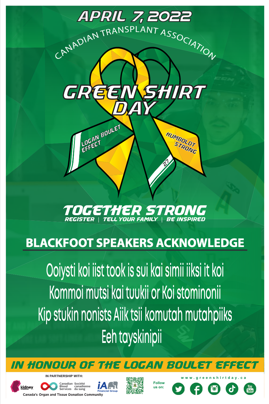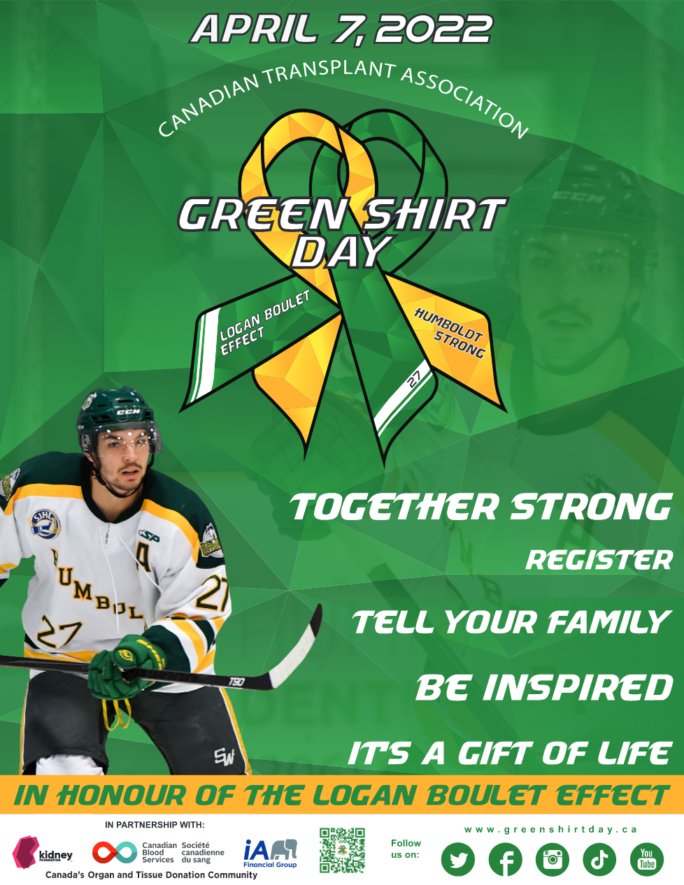 This year, Green Shirt Day is accompanied by a new logo inspired by the Logan Boulet Effect and the Humboldt Broncos, created by University of Lethbridge alumnus Joshua Wong (BFA - New Media/BMgt ’20).