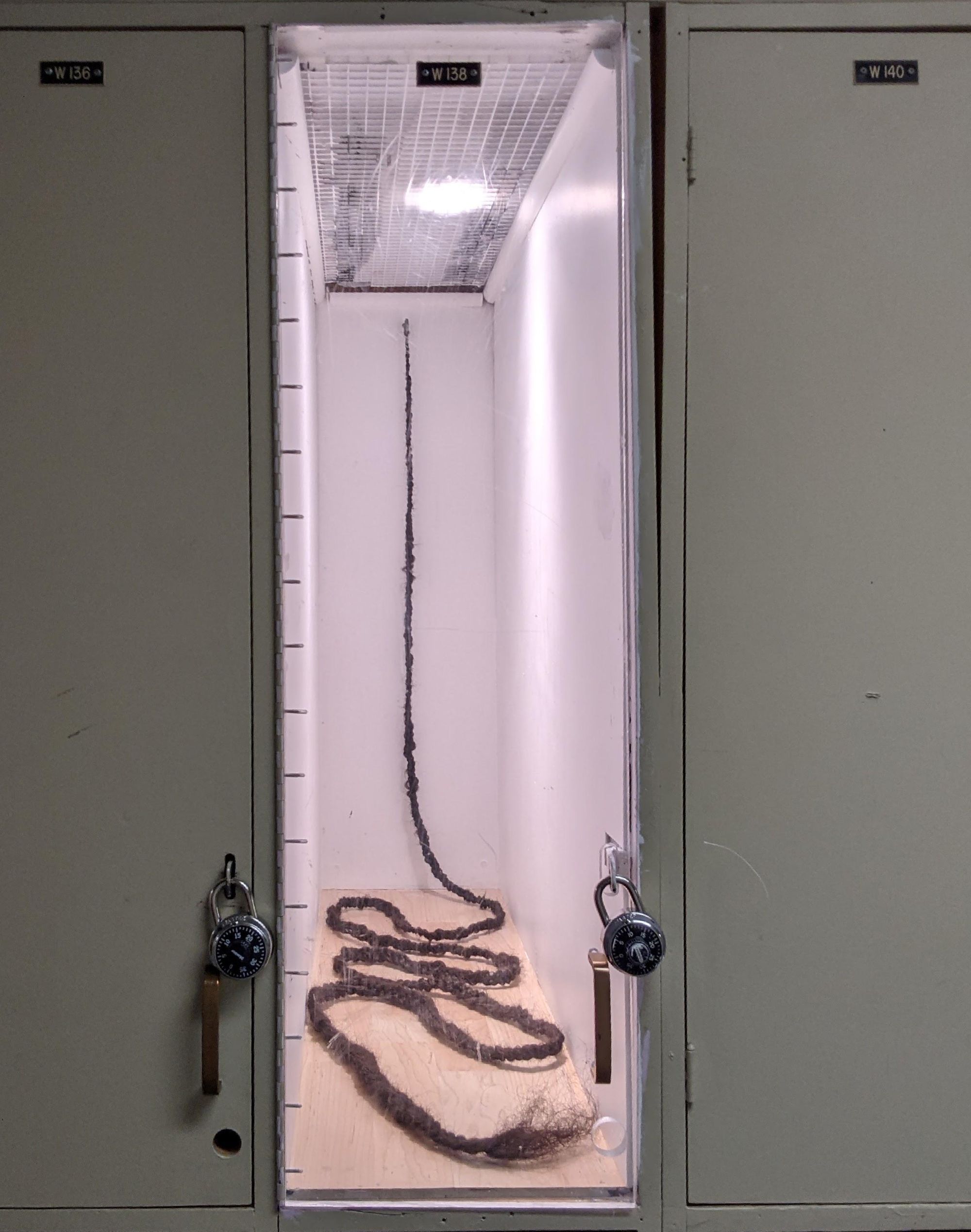 In regards to hair, Kaela is working with it as a material. Stemming from a haircut she received in 2019, Kaela held on to that hair as she was unsure how she wanted to explore working with it. In 2021, she decided to braid it. The braid is currently 11’3” long and Kaela is in the process of adding length from a second hair cut from early 2021. Kaela says her work on the braid is more than just the materiality of it or about the crossing of boundaries, adding there is a lot of beauty in the work.
