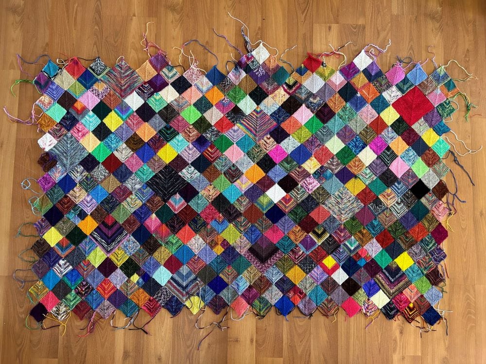 I can knit for hours on end, and have become somewhat infamous for my "conference socks," where I try to knit a pair of socks from start to finish, whenever I attend a conference - it helps me concentrate, when my hands are busy. The photo I've included is of a sock yarn blanket made from scraps and mini skeins. I've been working on it for ten years already, and it will probably take another ten years to finish, but it is my pride and joy.