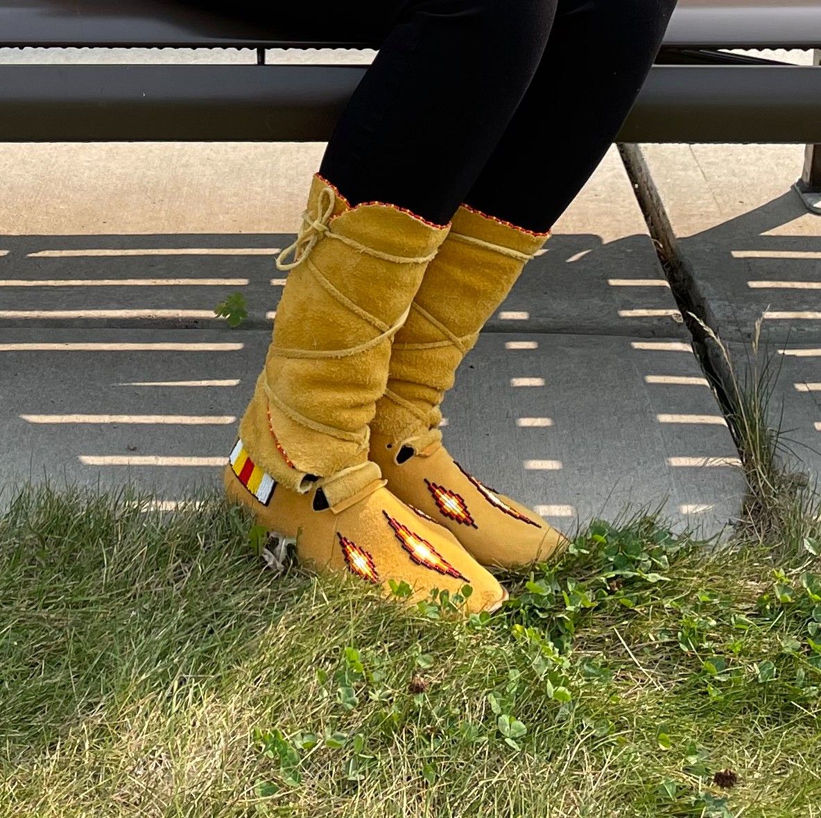 "Oki, my Blackfoot name is Pohkakii and I am from the Kainai Nation. My moccasins have the colours of my mother's family on the side and were gifted to me when I graduated from Red Crow College in 2019."
