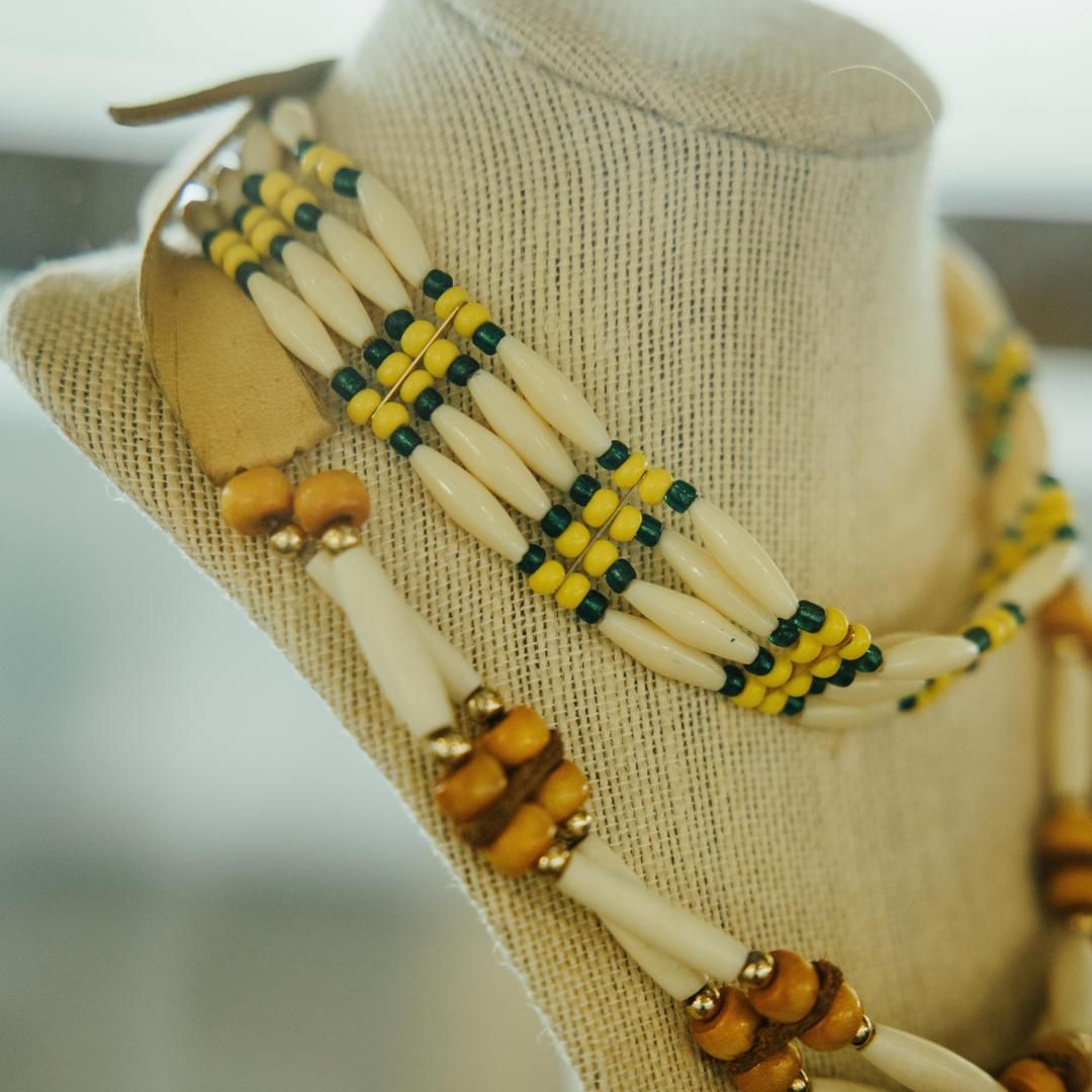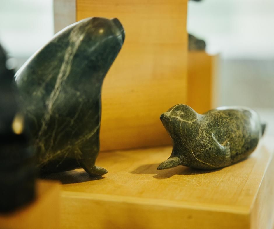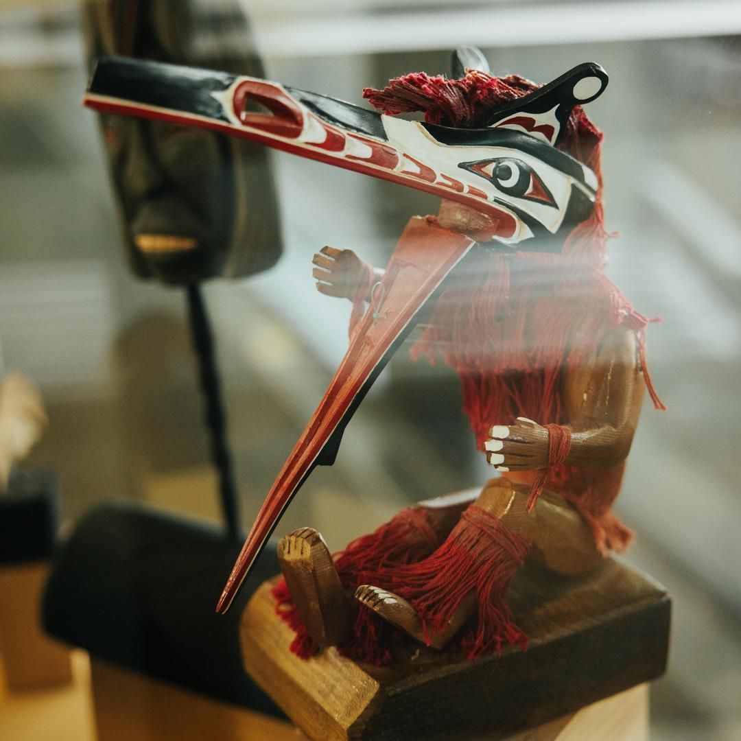 The four displays focus on art and artifacts from four different regions include pieces like a fiery red Kwakwakaʼwakw dancer and copper shield necklace from the West coast Indigenous people; powwow ceremonial items like Blackfoot buffalo rattle and gifting items like buffalo teeth from Eastern Indigenous people; Inuit soapstone carvings from the people of the North; and the four sacred medicines of tobacco, sweet grass, sage and cedar, each from a different part of Turtle Island, the name used by Indigenous people to describe North America.