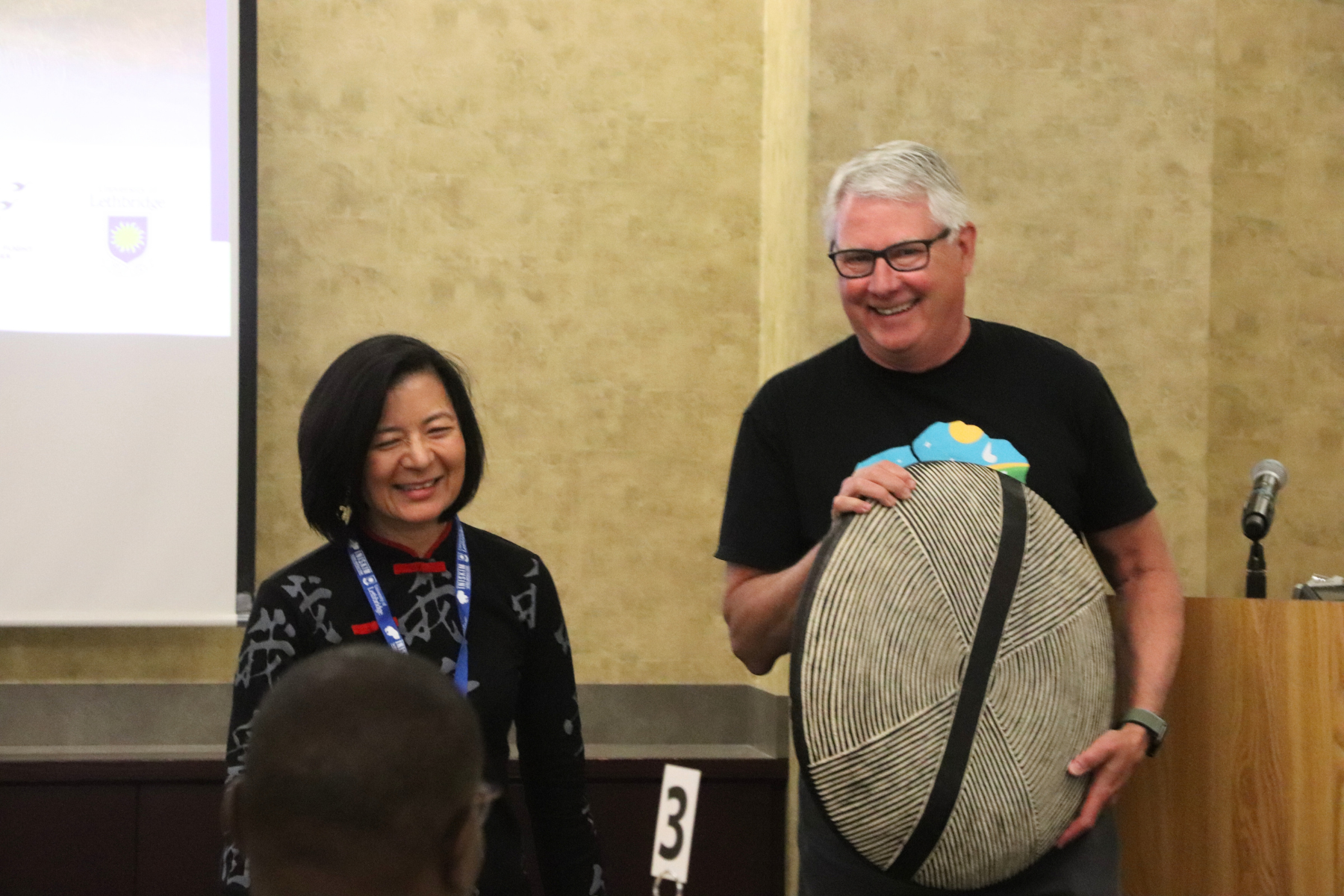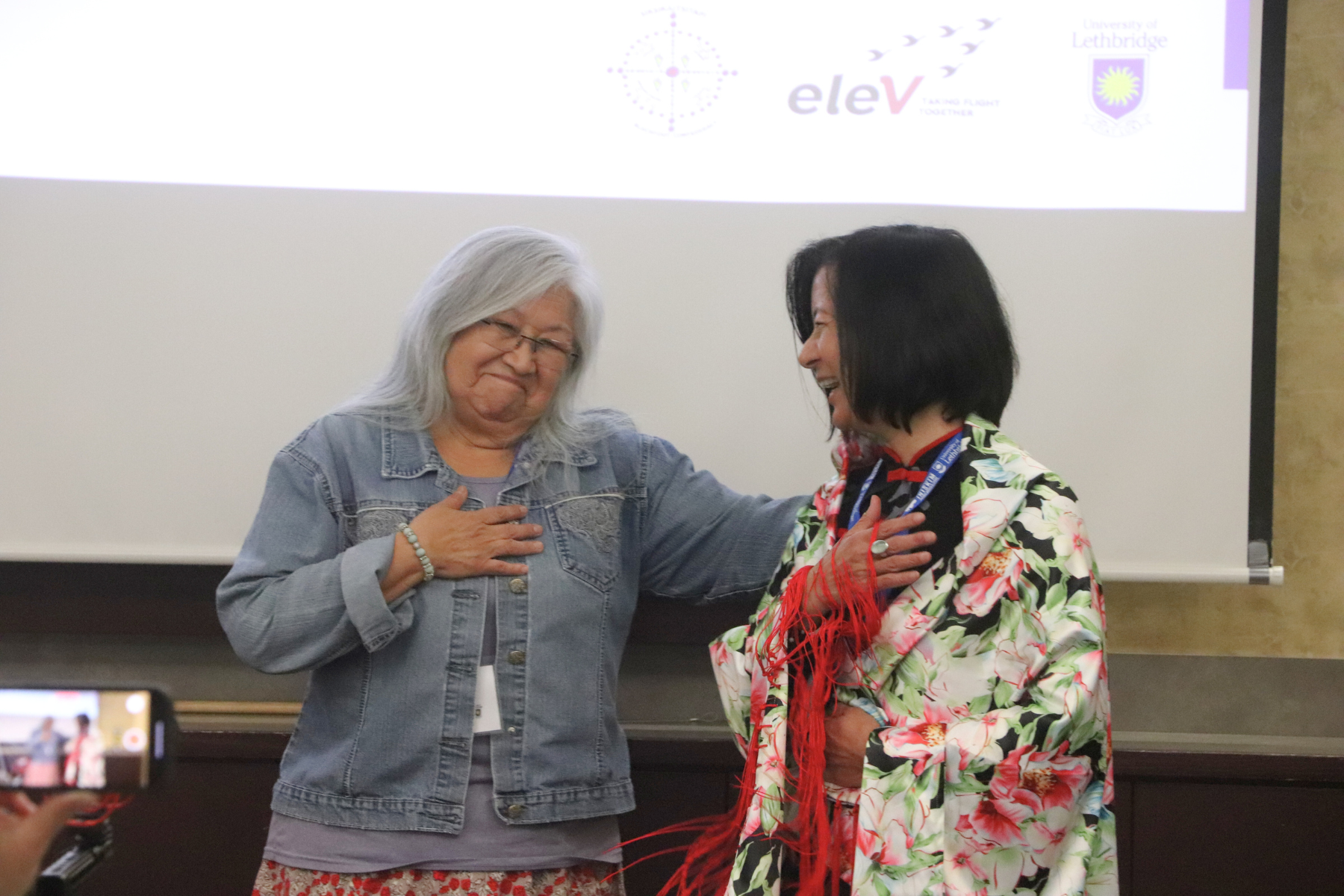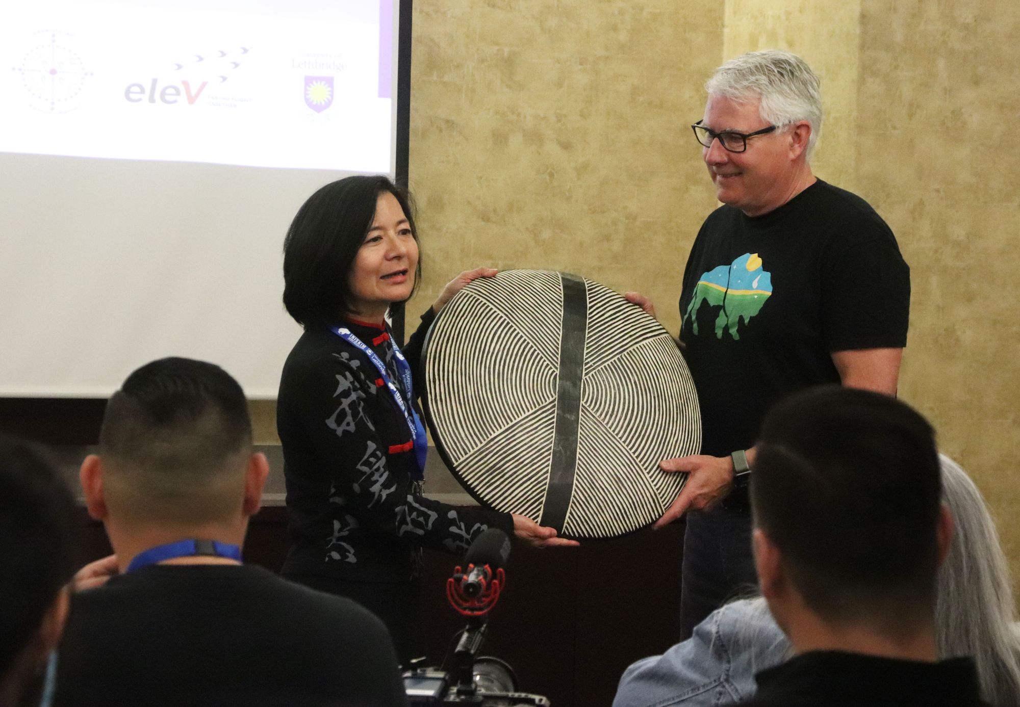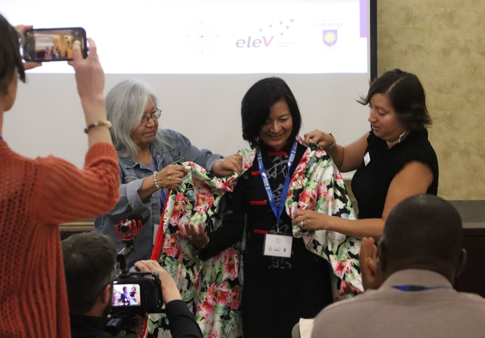 During the first day of the conference, the ULethbridge EleV Team presented Mastercard Foundation president and CEO Reeta Roy with a shawl made by local artist and member of the Kainai Nation, Geraldine Thunder Chief. Elder Staah’tsi’naims’skaa’ki (Thunder Pipe Woman Under the Sky), Cathy Hunt sang Reeta a praise song to honour and thank her for her commitment to the ULethbridge EleV Program in supporting Blackfoot youth in their education and economic journeys. Reeta also presented ULethbridge president and vice-chancellor Iipisowaahsiiyi (Morning Star), Dr. Mike Mahon with a special gift.