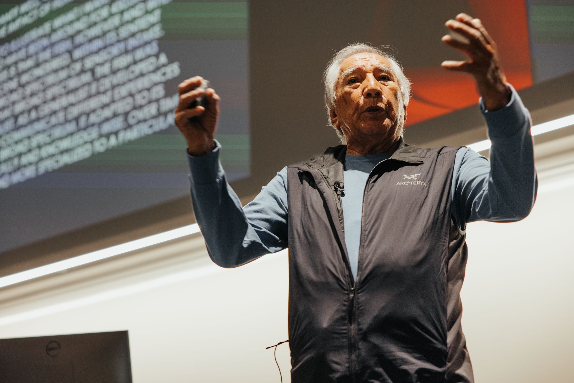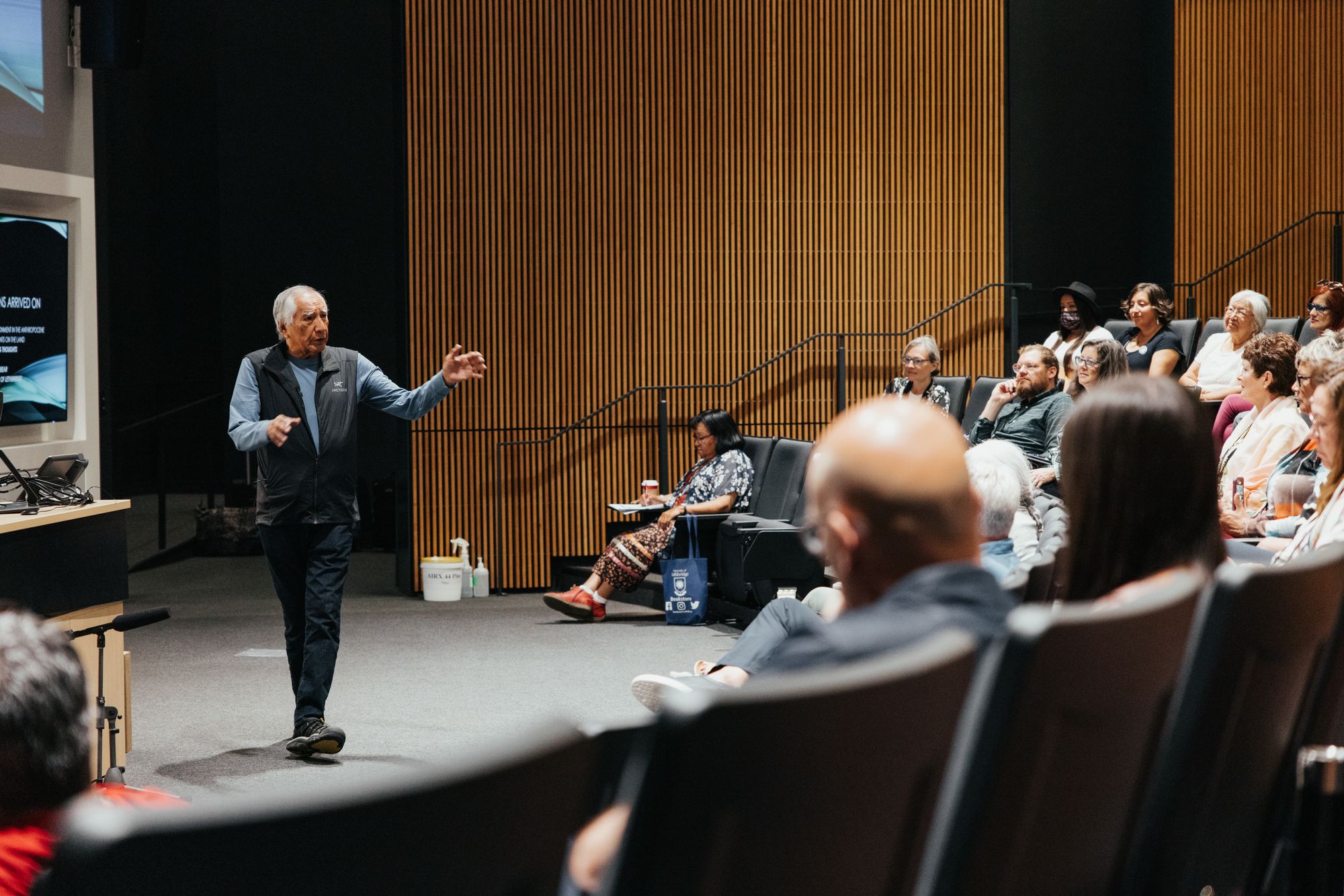 Dr. Leroy Little Bear (BASc (BA) ’72, DASc ’04), Iikaisskini (Low Horn), tells the story of The Three Sisters and their gifts to Indigenous Peoples to a captivated audience. The gifts of The Three Sisters are represented by corn, beans and squash. As Little Bear explains, the corn provides the climbing pole for the beans, which provides nutrition for the corn and squash, while the squash provides a protective covering for the plants. They are a community and their success depends on one another.