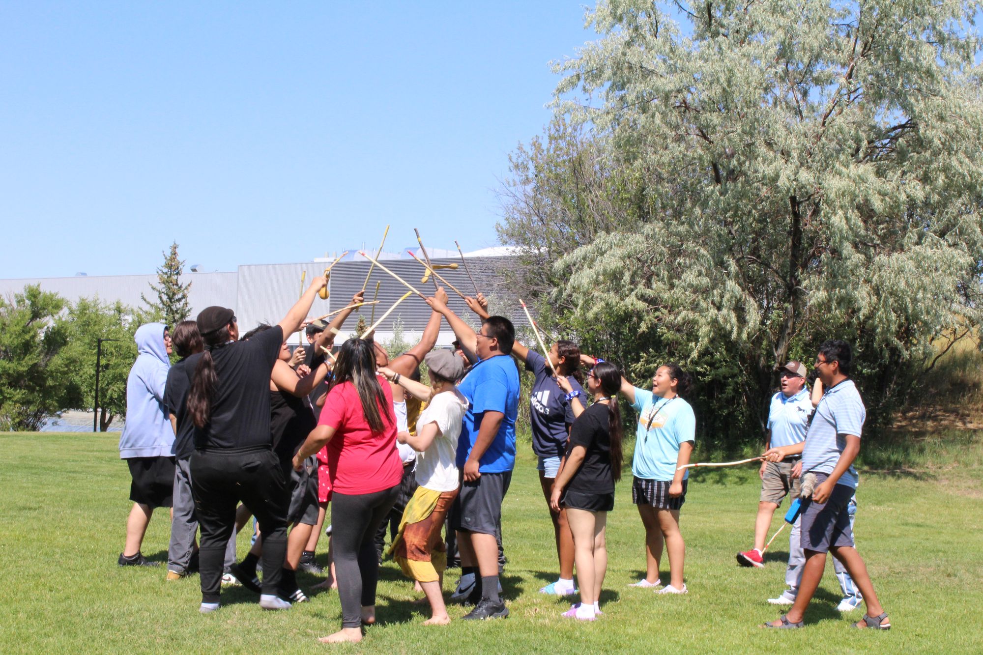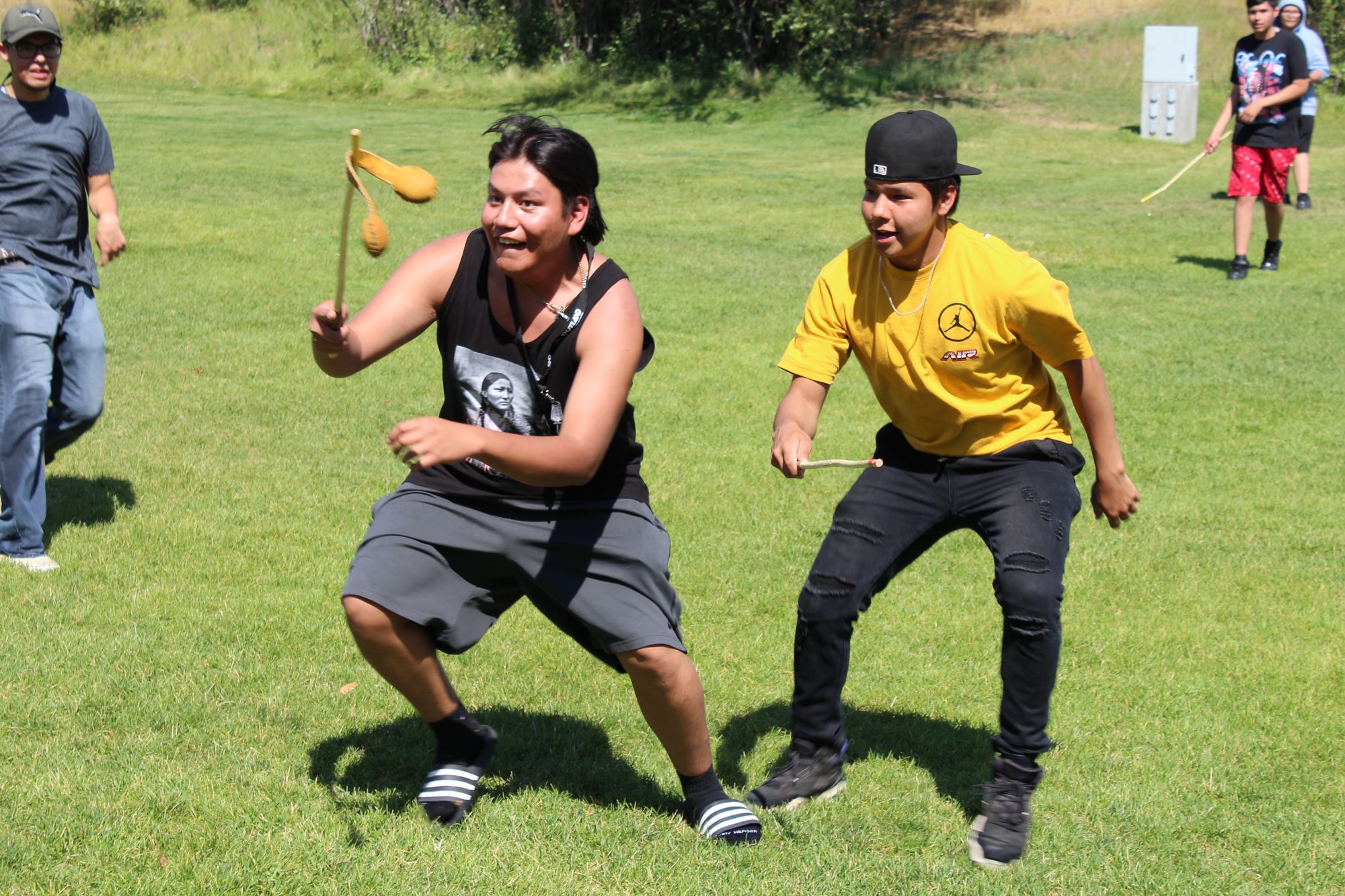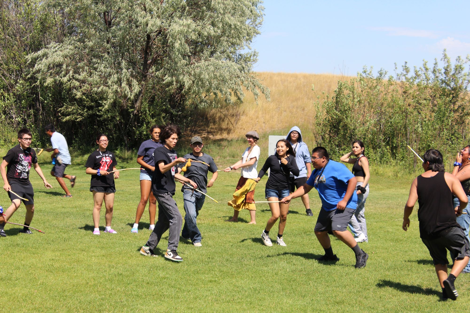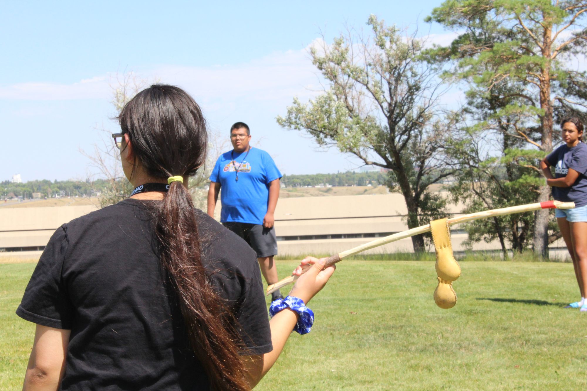 Double ball is a traditional sport played among First Nations in North America, similar to lacrosse. It is played with long sticks and two balls stitched together. The object of the game is to loop the balls onto the stick and pass between players until it is sent through the opposing team’s goal post. Led by Siksiikakoan (Blackfootman), Shane McDougall, who is working with Agility, the participants were taught the rules of the game and played an energetic game.