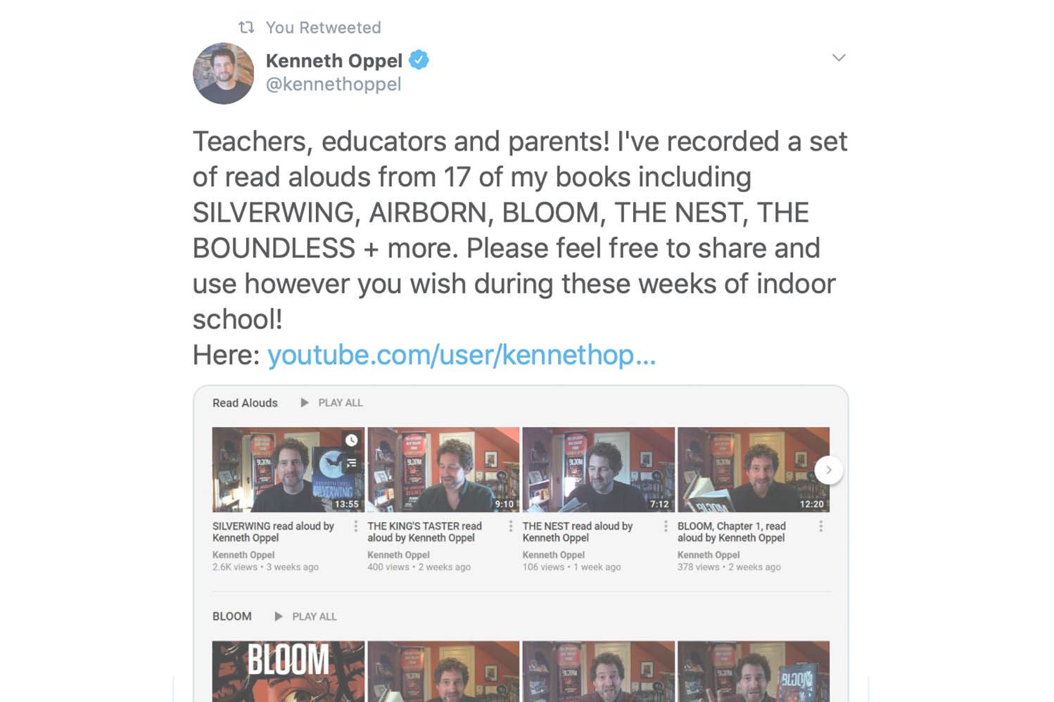 Link to Kenneth Oppel's readings: youtube.com/user/kennethoppel